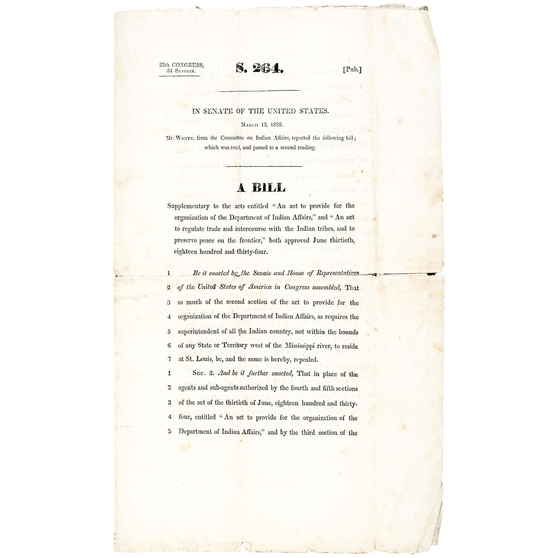 March 3, 1838-Dated, Official Printed Text of Senate Bill 264, Reorganizing the Department of Indian Affairs, About Fine.