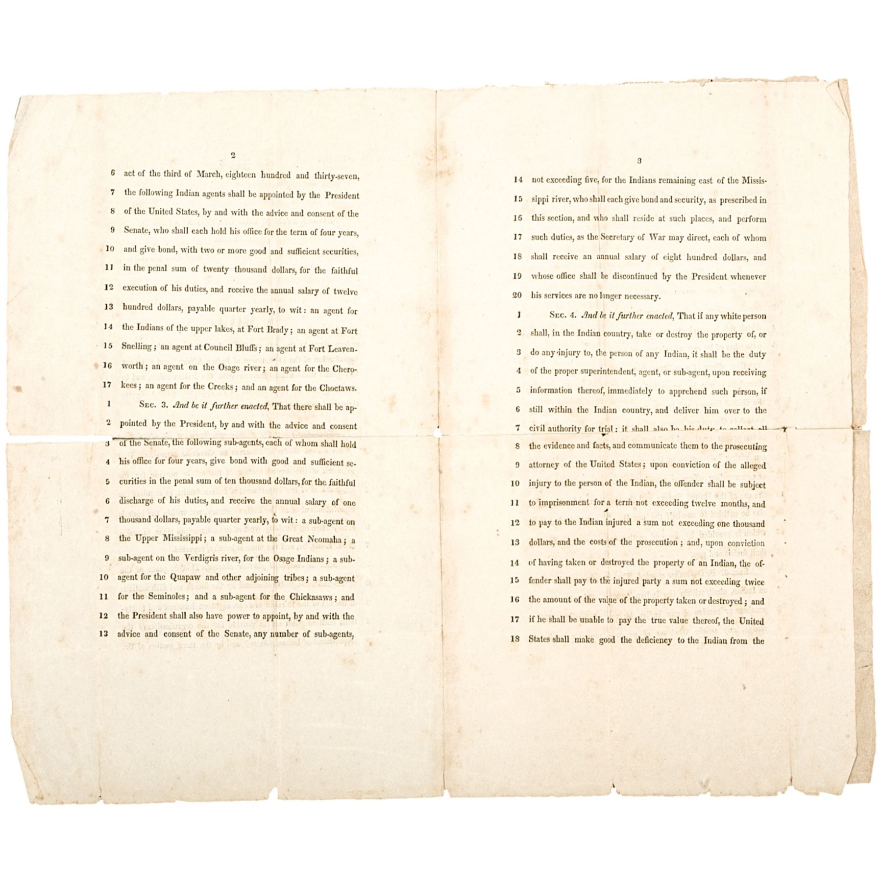 This 6 page, officially print of Senate Bill 264, measuring 13.5” x 8.5,” Amends the 1834 Bill which organized the Department of Indian Affairs. This new bill repeals the provision that the Superintendent of Indian Affairs reside at St. Louis, and outlines the various postings for Indian Agents and Sub-Agents. This document is in fair condition, complete and intact, lightly age toned, with several fold separations (one on the back page repaired with stamp hinges) and a small amount of writing on the back page (not affecting any text). Postings for Indian Agents were to be at Fort Brady; Fort Snelling; Council Bluffs; Fort Leavenworth; the Osage River; an agent for the Cherokees; an agent for the Creeks; and an agent for the Choctaws. Sub-Agents for other tribes and locations are also listed.