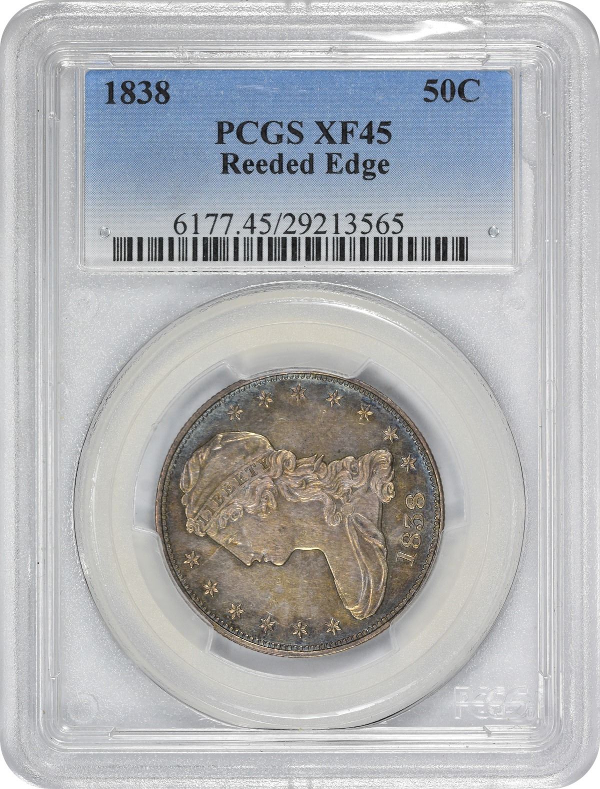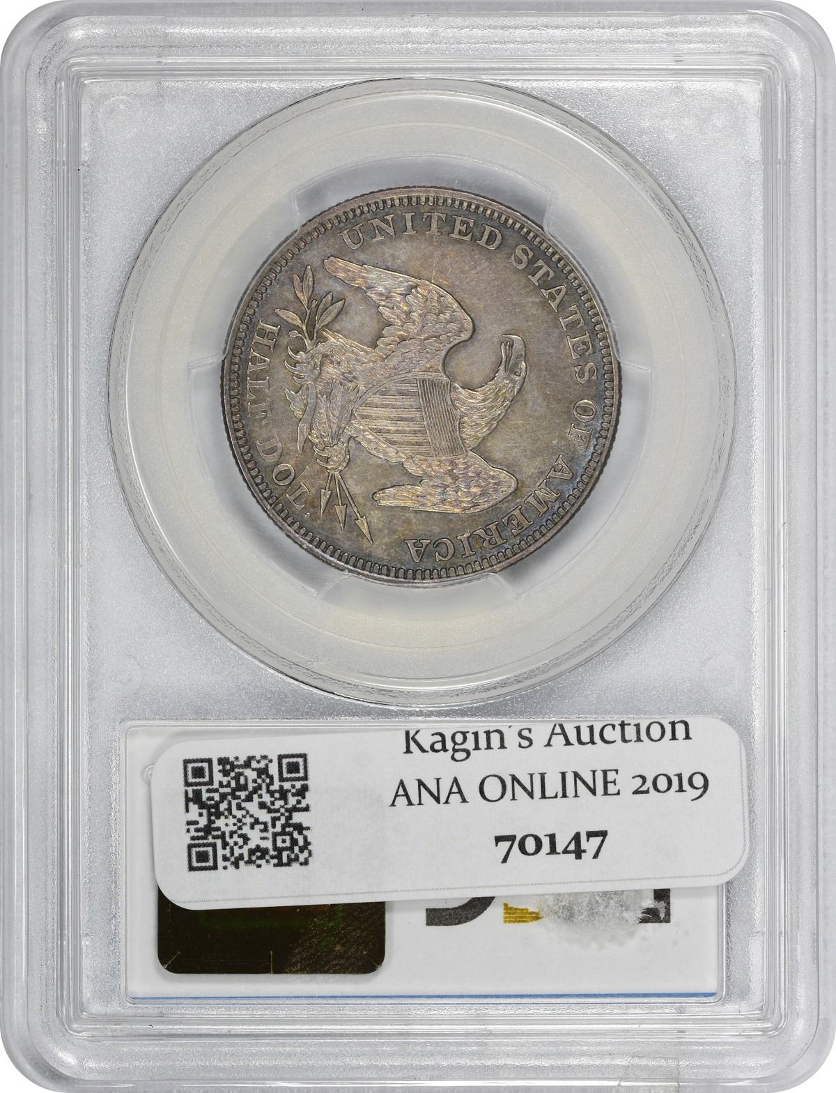 Lustrous steel-gray with lively neon-blue and pale golden highlights. Struck from cracked dies with notable cracks on the obverse and reverse; definitely a late die state. Denomination as HALF DOL. PCGS #6177