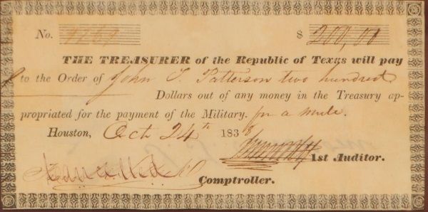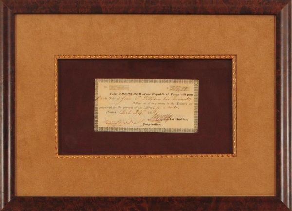 "Treasurer of the Republic of Texas will pay..." for a mule in Houston on Oct. 24th 1838. Check measures 5 1/2" wide and 3" tall, frame measures 15 1/2" wide and 11 1/2" tall.