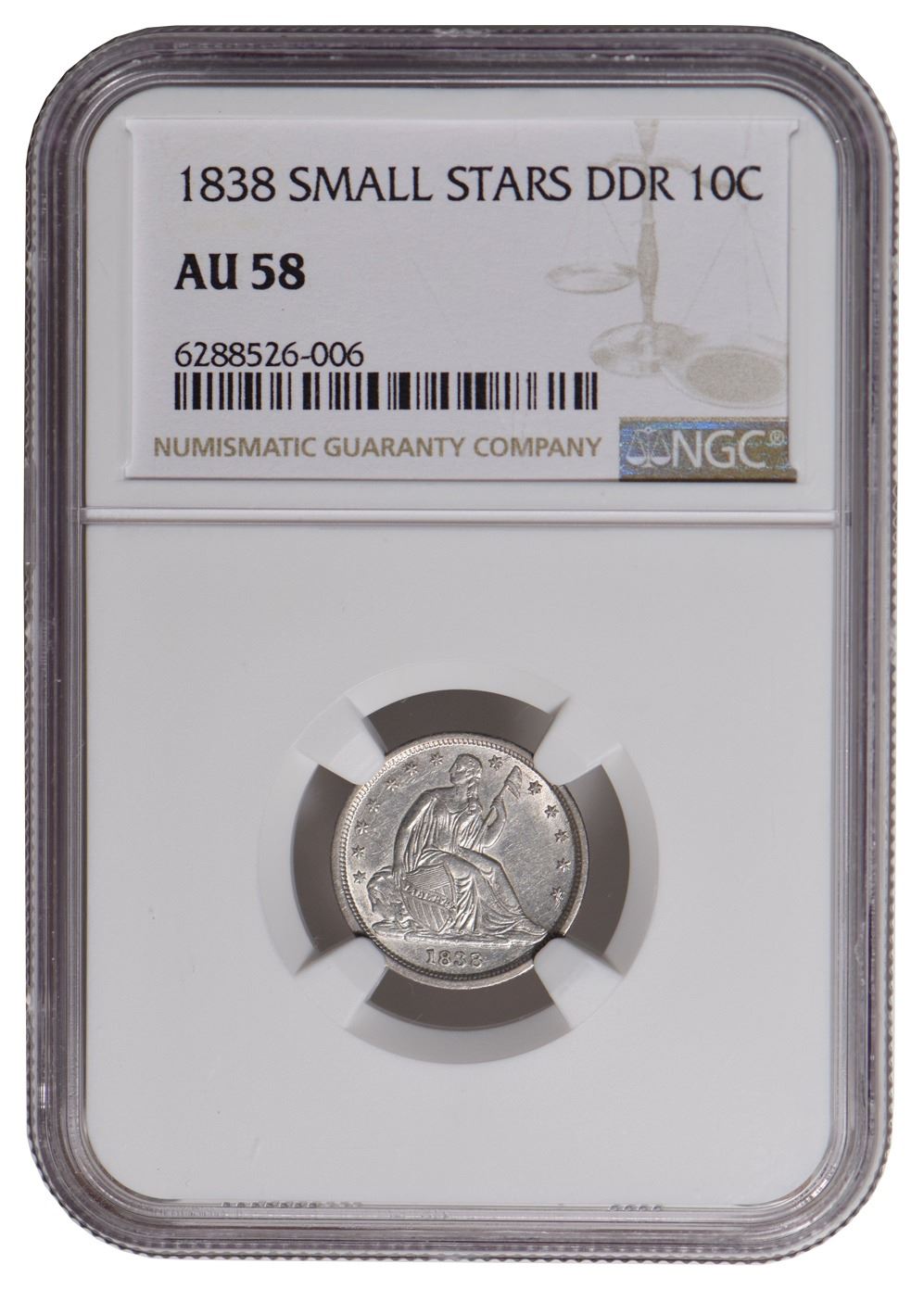 One 1838 Seated Liberty Small Starts Dime NGC AU58.