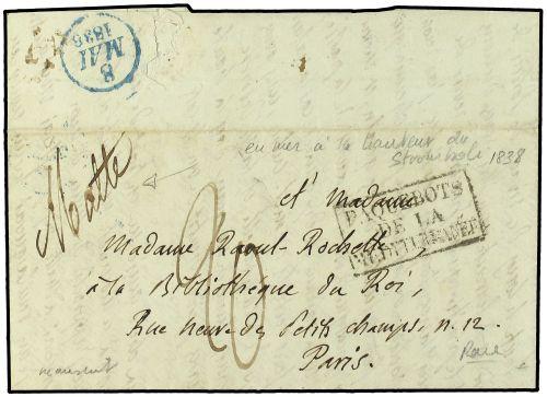 1838 Stampless envelope addressed to PARIS written from "La Hauteur de Stromboli" at Malta with manuscript "MALTA" and boxed PAQUEBOTS DE LA MEDITERANEE and charged "20" on arrival in manuscript. Very rare item.