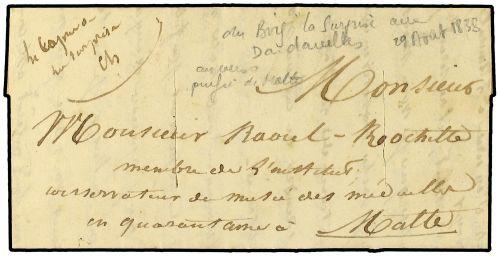 1838 Stampless envelope written from the "Brig, La Surprise off the Dardenalles" addressed to the "Conservator of the Museum des Miedaull, in Quarantine at Malta" with disenfection slits and PURIFIE AU LAZARET/MALTA on reverse. Very fine item.