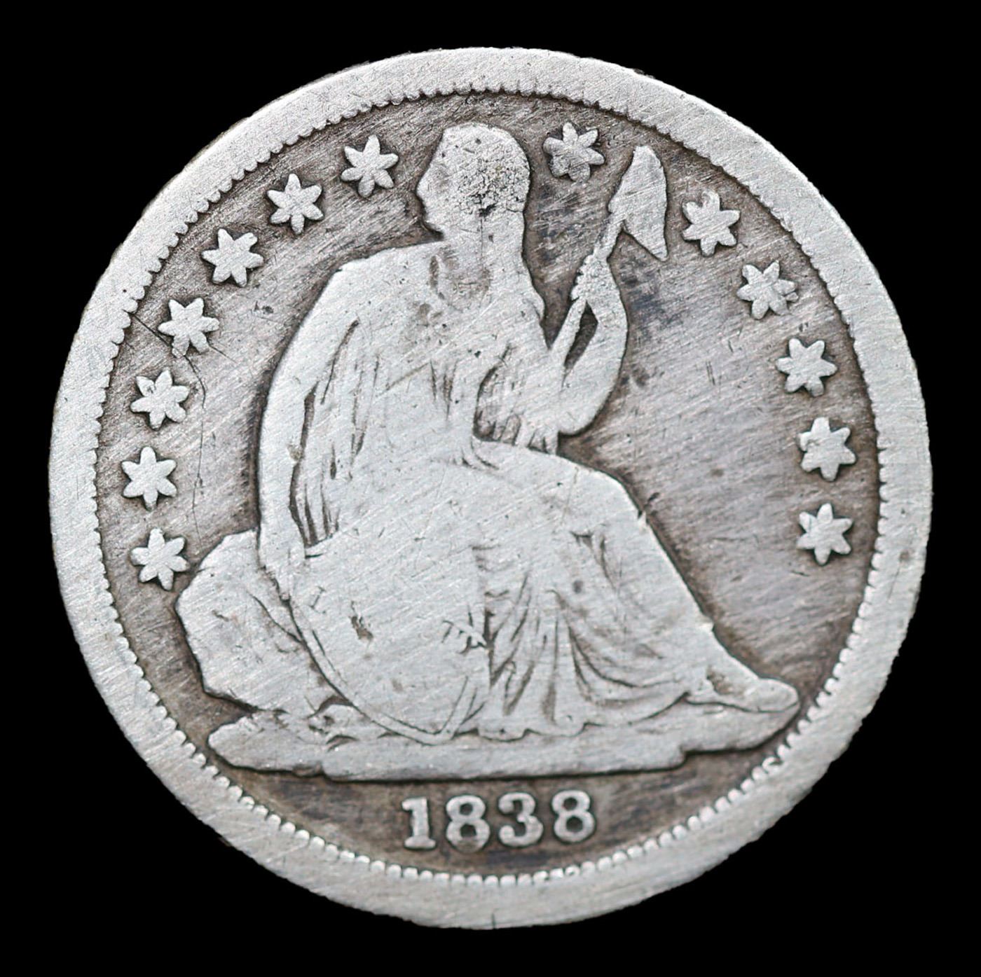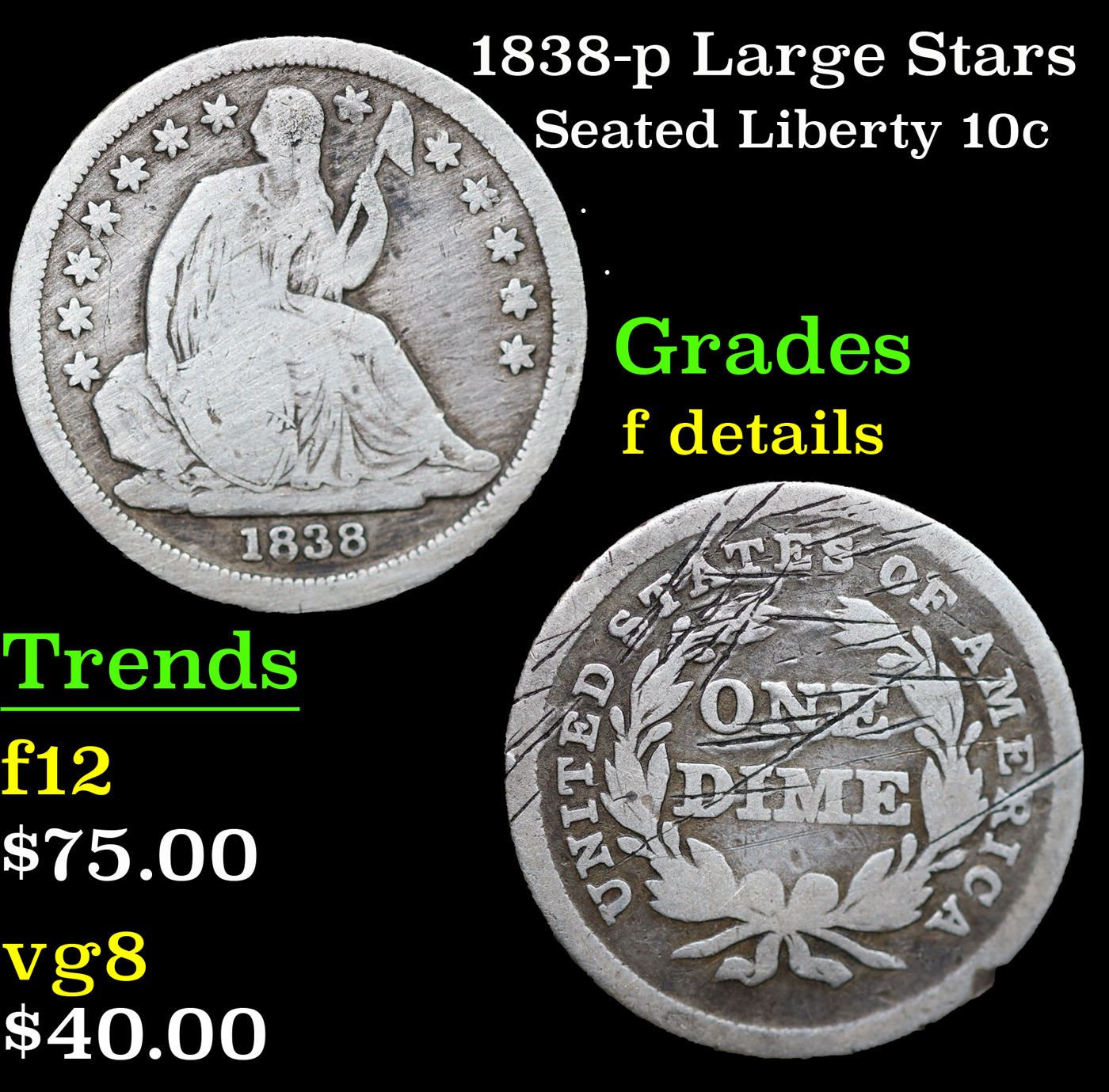 1838-p Large Stars Seated Liberty Dime 10c Grades f details.