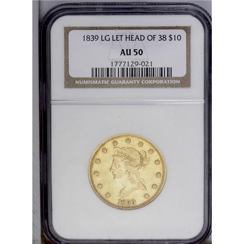 1839 $10 Type of 1838, Large Letters AU50 NGC. This is