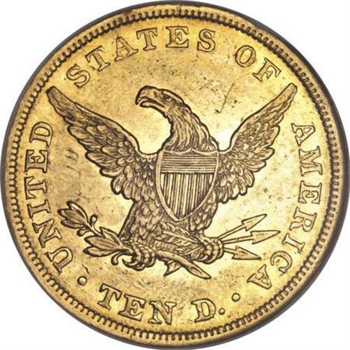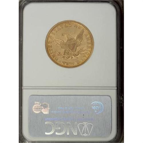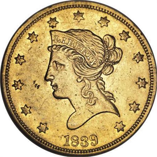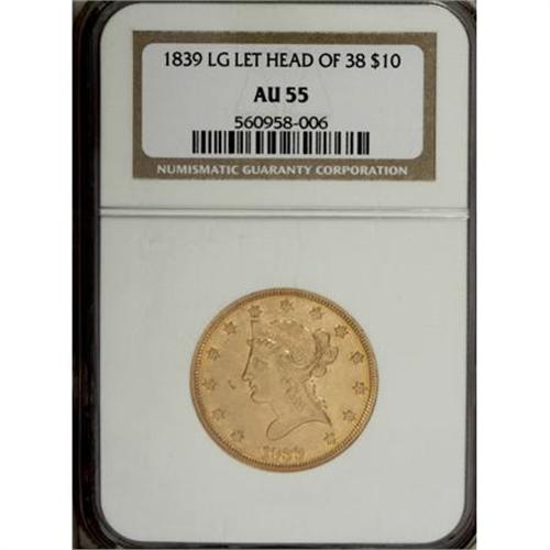 <B>1839 $10 Type of 1838, Large Letters AU55 NGC.</B></I> The "Head of 1838", with a curved bust truncation and a sweep of hair over part of the ear, was struck only in 1838 and for part of 1839. This scarce subtype is usually omitted from most gold type sets, but that could change in the future. This nicely struck and slightly glossy example has ample glowing luster and no offensive marks.<BR><BR><b>Shipping:</b> Coins & Currency (<a target="_blank" href="http://www.heritageauctions.com/common/shipping.php">view shipping information</a>)