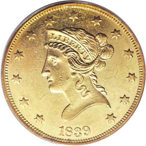 <B>1839 $10 Type of 1838, Large Letters AU55 PCGS.</B></I> The Type of 1838 was formerly known as the Large Letters, to distinguish it from the redesigned Type of 1840/Small Letters coins that followed later in the year, but the type could just as easily be called Pointed Bust. This piece is a virtual match for the 1838 eagle in this same auction, if in a bit higher grade. Although Walter Breen's <I>Complete Encyclopedia</B></I> enumerates a nonoverdate 1839, the smart money today says such a coin is a late die state of the overdate.<BR> The present example shows bold traces of the underdigit 8 protruding from beneath the bottom-right loop of the 9. Much luster remains over the orange-gold surfaces, and the entire coin offers an extremely pleasing appearance. Population: 11 in 55, 17 finer (3/07).<BR><BR><b>Shipping:</b> Coins & Currency (<a target="_blank" href="http://www.heritageauctions.com/common/shipping.php">view shipping information</a>)
