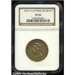 <B>1839<$10> Type of 1838, Large Letters VF25 NGC.</B></I> Many 1839 Tens came from the same source, a banker, who pulled these pieces out of bullion holdings in Swiss banks in the 1940s and '50s. Light in color, the surfaces are peppered with numerous small marks and a few tiny edge nicks. The striking details are a tad soft. <BR><BR><B>Important notice:</B> Heritage usually auctions material at the rate of 200-250 lots per hour. On some occasions eBay Live bid software or the Internet may not be able to keep up with the pace of the auction. We recommend placing a realistic absentee bid now as insurance to avoid disappointment. Occasionally the auctioneer may eliminate or reject an eBay Live bid, and the auctioneer may also reopen a lot after the close of the eBay live bidding (usually because we missed an audience bid), and may reject your bid even if it shows you as the winning bidder. By bidding via eBay Live, you agree that Heritage may award the lot to another bidder at its sole discretion under the circumstances described above or any other reasonable circumstances. Since eBay bids are not shown to us until we open the lot on the floor, we treat those bids just like floor bids. In most cases the floor responds before the eBay bid is presented to us, due to Internet lag time, so for consistency we have made it a policy that floor bids are always considered first over tie eBay live bids. Also please note that all Heritage lots purchased through eBay Live carry a 20% Buyer's Premium. Please make sure you read the Terms and Conditions before you bid.