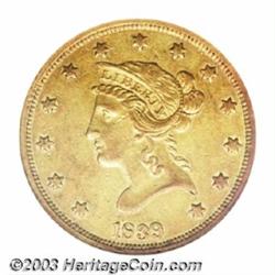 <table><tr><td><TABLE cellSpacing=0 cellPadding=0 width="100%" bgColor=#000000 border=0><TBODY> <TR><TD width="100%"><TABLE cellSpacing=1 cellPadding=3 width="100%" border=0><TBODY><TR><TD width="100%" bgColor=#79735c><FONT face=arial color=#ffffff size=3><B>Description</B> </FONT></TD></TR><TR><TD width="100%" bgColor=#ffffff><FONT face=arial size=2><B>1839 $10 Type of 1838, Large Letters XF45 NGC.</B></I> Only 25,801 pieces were produced of this distinctive type, known as the "Old Portrait" type among collectors of previous generations, and examples are seldom seen any finer than the example here offered. This example displays distinctive, original rose-orange toning over surfaces that display light wear over the highpoints but relatively few abrasions for the grade. An attractive example that will likely soon repose in an appreciative specialists collection. </FONT></TD></TR></TBODY></TABLE></TD></TR></TBODY></TABLE><BR><A name=PricesRealized></A><TABLE cellSpacing=0 cellPadding=0 width="100%" bgColor=#000000 border=0><TBODY><TR><TD width="100%"><TABLE cellSpacing=1 cellPadding=3 width="100%" border=0><TBODY><TR><TD width="100%" bgColor=#79735c><A name=PR><FONT face=arial color=#ffffff size=3><B>Previous Prices from Heritage Auctions</B> </FONT></A></TD></TR><TR><TD bgColor=#f6f6ed><TABLE cellSpacing=0 cellPadding=0 width="100%" border=1><TBODY><TR><TD align=middle width="33%"><B>Date</B></TD><TD align=middle width="33%"><B>Service</B></TD><TD align=middle width="33%"><B>Price</B></TD></TR><TR bgColor=whitesmoke><TD width="33%"><B>01/10/1998</B></TD><TD width="33%">NGC</TD><TD width="33%">$1,725.00</TD></TR><TR bgColor=whitesmoke><TD width="33%"><B>01/11/1997</B></TD><TD width="33%">NGC</TD><TD width="33%">$1,840.00</TD></TR><TR bgColor=whitesmoke><TD width="33%"><B>02/01/1997</B></TD><TD width="33%">ANACS</TD><TD width="33%">$2,420.00</TD></TR></TBODY></TABLE></TD></TR><TR><TD bgColor=#ffffff><FONT face=arial size=1 ?>PLEASE NOTE: All prices realized reflect the final hammer price PLUS the buyer's premium in auctions that charge a buyer's premium. Each item has a notation at the top of the listing indicating whether that lot included a buyer's premium. Example: A item that sells with a final hammer price of $100 and a 20% buyer's premium will display with a price realized of $120. All information listed is intended to be as accurate as possible, but errors are possible. Please use this guide carefully and inform us of any inaccuracies. </FONT></TD></TR></TBODY></TABLE></TD></TR></TBODY></TABLE><BR><TABLE cellSpacing=0 cellPadding=0 width="100%" bgColor=#000000 border=0><TBODY><TR><TD width="100%"><TABLE cellSpacing=1 cellPadding=3 width="100%" border=0><TBODY><TR><TD width="100%" bgColor=#79735c colSpan=6><FONT face=arial color=#ffffff size=3><B>Price Guide*</B> </FONT></TD></TR><TR bgColor=#f6f6ed><TD align=middle><B>Grade</B> </TD><TD align=middle><B>Coin World<BR>(Trends)</B> </TD><TD align=middle><B>Numismedia<BR>Retail</B> </TD><TD align=middle><B>Numismedia<BR>Wholesale</B> </TD><TD align=middle><B>Coin<BR>Universe</B> </TD><TD align=middle><B>Heritage<BR>Value Index</B> </TD></TR><TR bgColor=#ffffff><TD align=middle>40</TD><TD align=right>$1,850.00</TD><TD align=right>---</TD><TD align=right>$1,725.00</TD><TD align=right>$1,950.00</TD><TD align=right>$1,314.17</TD></TR><TR style="FONT-WEIGHT: bold" bgColor=#cccfdd><TD align=middle>45</TD><TD align=right>$3,000.00</TD><TD align=right>---</TD><TD align=right>---</TD><TD align=right>---</TD><TD align=right>$2,357.08</TD></TR><TR bgColor=#ffffff><TD align=middle>50</TD><TD align=right>$4,950.00</TD><TD align=right>---</TD><TD align=right>$3,675.00</TD><TD align=right>---</TD><TD align=right>$3,586.67</TD></TR><TR bgColor=#ffffff><TD colSpan=6><FONT size=1>*All information listed is intended to be as accurate as possible, but errors are possible. No item may be returned or refused based on this information which is provided as a service to our customers. You should contact each pricing source directly to determine the accuracy of this information. </FONT></TD></TR></TBODY></TABLE></TD></TR></TBODY></TABLE><BR><TABLE cellSpacing=0 cellPadding=0 width="100%" bgColor=#000000 border=0><TBODY><TR><TD width="100%"><TABLE cellSpacing=1 cellPadding=3 width="100%" border=0><TBODY><TR><TD width="100%" bgColor=#79735c><FONT face=arial color=#ffffff size=3><B>Population Guide</B> </FONT></TD></TR><TR bgColor=#ffffff><TD align=middle><!-- Begin Output of Population Grid--><TABLE cellSpacing=0 cellPadding=0 width="100%" border=0><TBODY><TR><TD vAlign=center><TABLE cellSpacing=0 width="100%" border=1 cellsadding="3"><TBODY><TR><TD vAlign=center><TABLE cellSpacing=0 cellPadding=3 width="100%" border=1><TBODY><TR><TD vAlign=center align=middle bgColor=#f0f1e8 colSpan=2 <CENTER><FONT face=Arial size=2><B>PCGS Pop </B></FONT><CENTER></CENTER></TD><TD vAlign=center align=middle bgColor=#f0f1e8 colSpan=2><CENTER><FONT face=Arial size=2><B>NGC Pop</B></CENTER></FONT></TD></TR><TR><TD vAlign=center><FONT face=Arial size=2>(45)</FONT> </TD><TD vAlign=center align=right><FONT face=Arial size=2>19</FONT> </TD><TD vAlign=center><FONT face=Arial size=2>(45)</FONT> </TD><TD vAlign=center align=right><FONT face=Arial size=2>25</FONT> </TD></TR><TR><TD vAlign=center><FONT face=Arial size=2>(>45)</FONT> </TD><TD vAlign=center align=right><FONT face=Arial size=2>45</FONT> </TD><TD vAlign=center><FONT face=Arial size=2>(>45)</FONT> </TD><TD vAlign=center align=right><FONT face=Arial size=2>60</FONT> </TD></TR></TBODY></TABLE></TD></TR></TBODY></TABLE></TD></TR></TBODY></TABLE><!-- End Output of Population Grid--></TD></TR></TBODY></TABLE></TD></TR></TBODY></TABLE><BR><TABLE cellSpacing=0 cellPadding=0 width="100%" bgColor=#000000 border=0><TBODY><TR> Important notice: Heritage usually auctions material at the rate of 200-250 lots per hour. On some occasions eBay Live bid software or the Internet may not be able to keep up with the pace of the auction. We recommend 