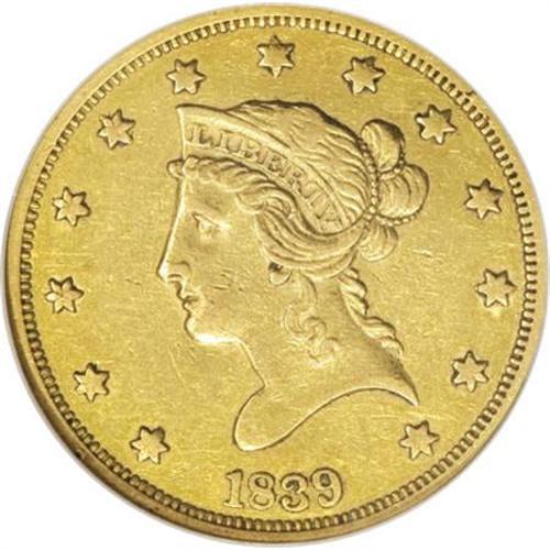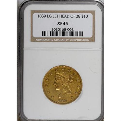 <B>1839 $10 Type of 1838, Large Letters XF45 NGC.</B></I> 1839 was a transitional year for the ten dollar design. The Head of 1838 differs substantially from the more familiar portrait of Liberty present on the 1840 and later dates. For the Head of 1838, the bust truncation is curved, the head leans forward, and a sweep of hair covers most of the ear. This well-detailed Choice XF example is slightly glossy and displays noticeable luster. Marks are minimal for the grade.<BR><BR><b>Shipping:</b> Coins & Currency (<a target="_blank" href="http://www.heritageauctions.com/common/shipping.php">view shipping information</a>)
