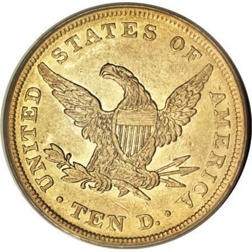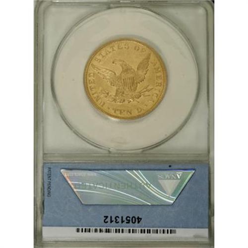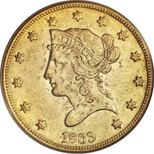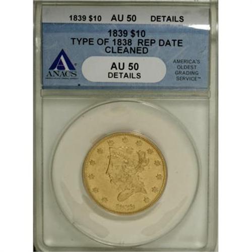 <B>1839 $10 Type of 1838, Large Letters--Cleaned--ANACS. AU50 Details.</B></I> ANACS notes this coin as "Repunched Date," but many--perhaps most--numismatists know it as the 1839/8 overdate. The hair style and bust truncation, as well as the reverse letter style, differ significantly from the later Type of 1840. This piece show light hairlines, and numerous small digs appear on the portrait of Liberty. The reverse is nicer, with some muted mint luster still peeking out from the recessed areas.<BR><I>From The John Stimson, Sr. Collection, Part Two.</B></I><BR><BR><b>Shipping:</b> Coins & Currency (<a target="_blank" href="http://www.heritageauctions.com/common/shipping.php">view shipping information</a>)