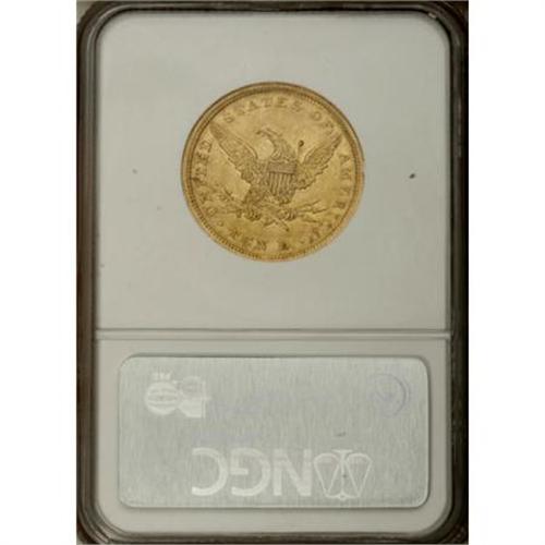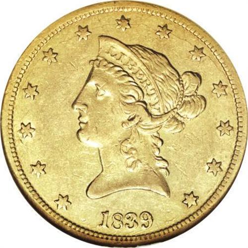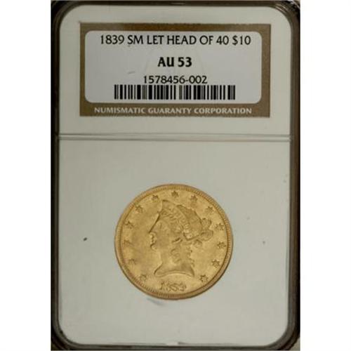 <B>1839 $10 Type of 1840, Small Letters AU53 NGC.</B></I> The new head style introduced in 1839 remained in production for the rest of the series. 1839 represents a transitional issue for the series, with both old and new head styles coined (and both in this sale). This lovely AU example has bright green-gold surfaces with excellent luster. A few light abrasions on each side are consistent with the grade. Census: 3 in 53, 14 finer (12/07).<BR><BR><B>Coin Engraver:</B> Christian Gobrecht<BR><BR><b>Shipping:</b> Coins & Currency (<a target="_blank" href="http://www.heritageauctions.com/common/shipping.php">view shipping information</a>)