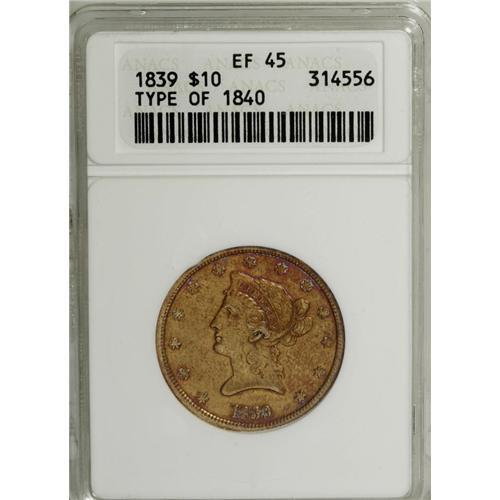 <B>1839 $10 Type of 1840, Small Letters XF45 ANACS.</B></I> With a mintage of slightly less than half of its Large Letters counterpart, the Type of 1840 is more elusive in all grades. The most striking detail about this piece is not its striking detail, though it has plenty of that in spite of light wear, but its still-lustrous surfaces, which are deep pumpkin-orange with copper-influenced rose and violet accents at the stars, date, shield, and peripheral reverse lettering. All in all, a desirable, lightly circulated example of this tricky type.<BR><BR><b>Shipping:</b> Coin/Currency (<a target="_blank" href="http://www.heritageauctions.com/common/shipping.php">view shipping information</a>)