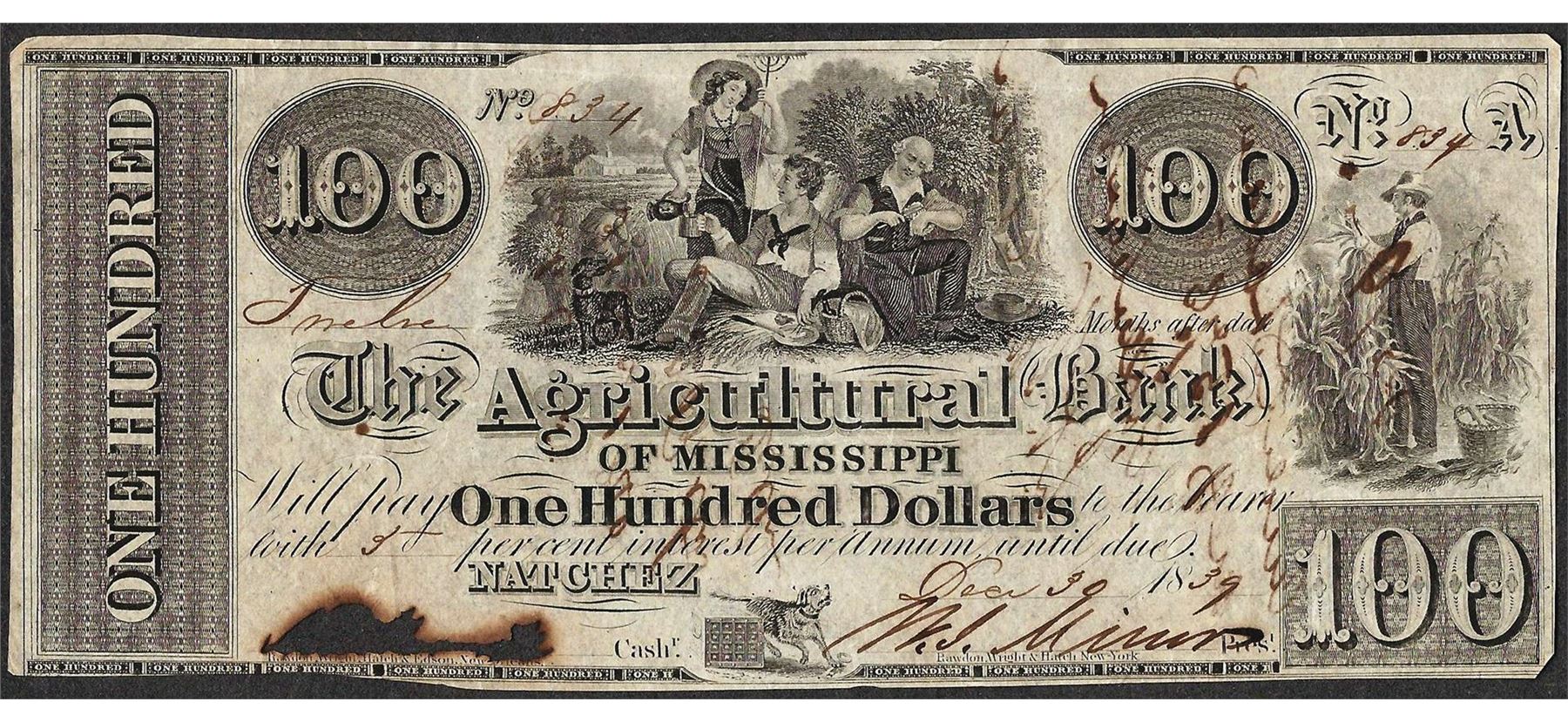 One 1839 $100 Agricultural Bank of Mississippi Natchez Obsolete Note.