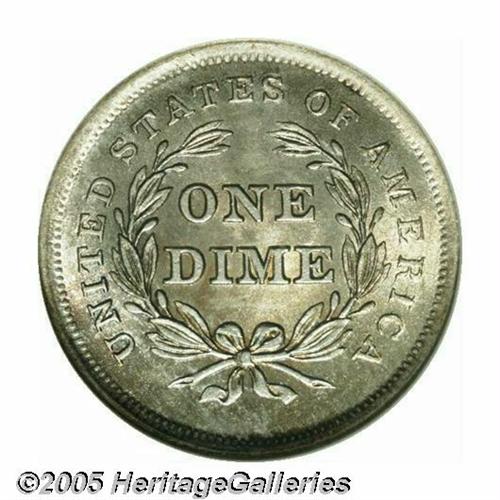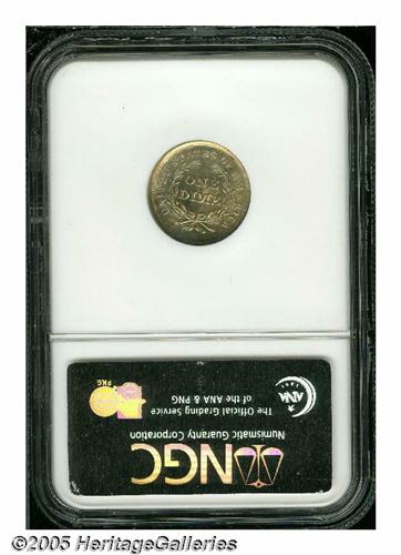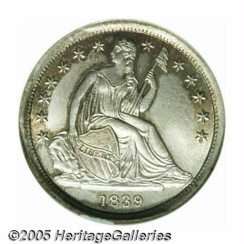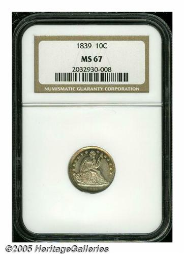 <B>1839<10C> No Drapery MS67 NGC.</B></I> No Drapery Dimes were only struck for three years and they are an important and widely collected type coin. This is one of the finer examples known. The striking details are fully defined in all areas with pinpoint definition on the star radials and the folds in Liberty's gown. A smattering of antique-golden and lime-green patina decorates the obverse, the reverse is similar but deeper in tone. As one might imagine, the surfaces are virtual perfection with no obvious abrasions evident to the unaided eye on either side. A wondrous type coin and seldom offered in such a superior state. Population: 13 in 67, 5 finer (4/05).<BR><I>From The Clifford Columbus Collection.</B></I>
