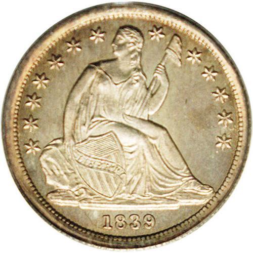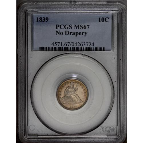 <B>1839<10C> No Drapery MS67 PCGS.</B></I> Fortin-101. The 39 in the date is lightly repunched. A penetratingly struck Superb Gem that features a prooflike obverse and a frosty reverse. Light golden-rose toning graces the margins but cedes to brilliant centers. A high grade example of this short-lived subtype. The Stars, No Drapery design was in used between 1838 and 1840. Population: 7 in 67, 2 finer (2/06).<BR><I>From The Lake Highlands Collection.</B></I> <BR><BR><B>Important notice:</