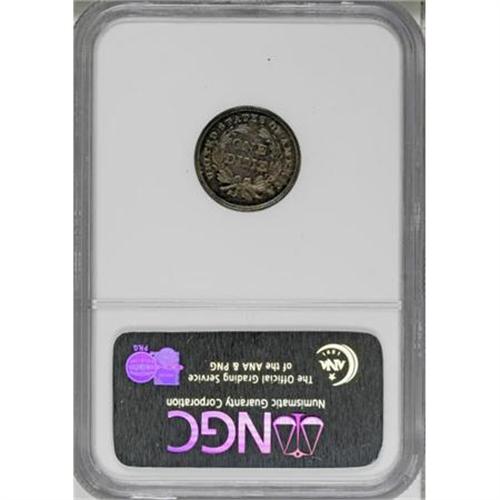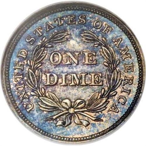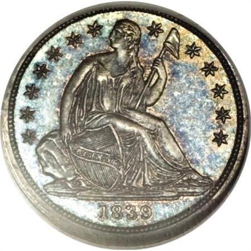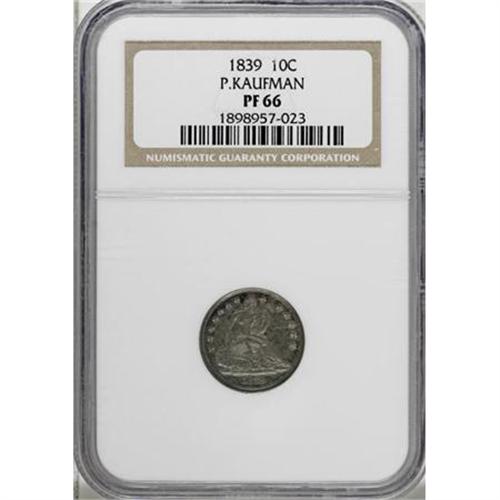 <B>1839 10C No Drapery PR66 NGC.</B></I> Ex: Lovejoy-Kaufman. This extraordinarily scarce 1839 dime is a featured rarity in the Kaufman collection. Purchased from the Allen F. Lovejoy Collection its one the finest<B> </B></I>of five or six known proofs. Indeed, it is two full points better than the second-place entry in our roster, although one other coin appears on the NGC Census Report as PR65.<BR> NGC and PCGS have reported a total of six 1839 proof dimes, including possible resubmissions. The NGC-graded PR66 Kaufman example is the finest certified, followed by an NGC PR65. That service has also certified a PR62 specimen. PCGS has graded two pieces as PR64, and one as PR62.<BR> Our roster of five different examples is in line with estimates of previous authors. Walter Breen estimates "possibly three proofs" in his <I>Complete Encyclopedia of U.S. and Colonial Coins</B></I> (1988), and the Bowers and Merena cataloger of the Eliasberg specimen (referenced below) suggests three to five known examples.<BR><BR><B> 1. PR66 NGC.</B></I> <B>The Kaufman coin.</B></I> 1976 ANA Sale (Stack's, 8/1976), lot 816; Allen F. Lovejoy (Stack's, 10/1990), lot 184. It is fascinating that the physical coin matches both plates, but the two plates do not seem to match when compared side-by-side.<BR><B> 2. PR64 PCGS.</B></I> Louis E. Eliasberg, Sr. (Bowers and Merena, 5/1996), lot 1114; Long Beach Connoisseur Collection (Bowers and Merena, 8/1999), lot 103; Richmond Collection (David Lawrence, 3/2005), lot 1234.<BR><B> 3. Choice Proof.</B></I> Hans M.F. Schulman (4/1951), lot 1206; Stack's (1/1991), lot 203.<BR> <B>4. PR64.</B></I> Superior (6/2002), lot 4157. This piece has a carbon spot in the upper reverse field.<BR> <B>5. PR62 PCGS.</B></I> Jascha Heifetz Collection (Superior, 10/1989), lot 3546.<BR><BR> Additional appearances:<BR> A. New Netherlands (47th Sale), lot 1629, impaired according to Walter Breen.<BR> B. Virgil Brand; New Netherlands (12/1958), lot 444. This example does not appear to match any of those listed above, and is possibly a sixth specimen.<BR><BR> Medium cobalt-blue toning resides in the open fields of this lovely Premium Gem, changing to violet hues in the areas immediately adjacent to the design elements. The devices are mostly silver-gray, with occasional splashes of blue, especially on the Liberty motif. In addition to the alluring coloration of the impeccably preserved surfaces, a bold strike imparts excellent definition to the design elements. The only identification mark is concealed within the toning beneath the O in ONE.<BR><I>From The Phil Kaufman Collection of Early Seated Proof Sets, Part Three.</B></I><BR><BR><B>Coin Engraver:</B> Christian Gobrecht<BR><BR><b>Shipping:</b> Coins & Currency (<a target="_blank" href="http://www.heritageauctions.com/common/shipping.php">view shipping information</a>)