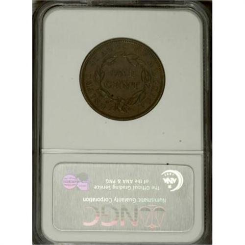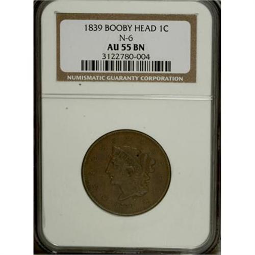 <B>1839 1C Booby Head AU55 NGC.</B></I> N-6. NGC Census: (11/103). PCGS Population (8/71). Mintage: 3,128,661. Numismedia Wsl. Price for NGC/PCGS coin in AU55: $440. (#1751)<BR><BR><B>Coin Engraver:</B> Robert Scot or John Reich<BR><BR><b>Shipping:</b> Coins & Currency (<a target="_blank" href="http://www.heritageauctions.com/common/shipping.php">view shipping information</a>)