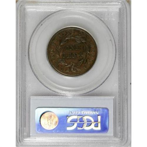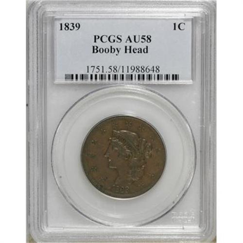 <B>1839 1C Booby Head AU58 PCGS.</B></I> PCGS Population (16/55). NGC Census: (10/94). Mintage: 3,128,661. Numismedia Wsl. Price for NGC/PCGS coin in AU58: $450. (#1751)<BR><BR><B>Coin Engraver:</B> Robert Scot or John Reich<BR><BR><b>Shipping:</b> Coins & Currency (<a target="_blank" href="http://www.heritageauctions.com/common/shipping.php">view shipping information</a>)