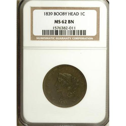 <B>1839 1C Booby Head MS62 Brown NGC.</B></I> N-6, R.2. Noyes Die State B with four faint reverse cracks. This satiny cent is crisply struck and unabraded. Deep brown with sea-green and ruby-red overtones. EAC 55.<BR><BR><B>Coin Engraver:</B> Robert Scot or John Reich<BR><BR><b>Shipping:</b> Coins & Currency (<a target="_blank" href="http://www.heritageauctions.com/common/shipping.php">view shipping information</a>)