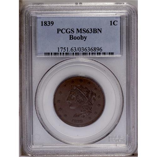 <B>1839<1C> Booby Head MS63 Brown PCGS.</B></I> N-13, R.2. A late die state with the reverse cracked through ED STAT and through ES. Lustrous olive-brown surfaces with a few splashes of darker color on both sides. A small rim pinch over TE of UNITED appears to be as struck. EAC 60. <BR><BR><B>Important notice:</B> Heritage usually auctions material at the rate of 200-250 lots per hour. On some occasions eBay Live bid software or the Internet may not be able to keep up with the pace of the auction. We recommend placing a realistic absentee bid now as insurance to avoid disappointment. Occasionally the auctioneer may eliminate or reject an eBay Live bid, and the auctioneer may also reopen a lot after the close of the eBay live bidding (usually because we missed an audience bid), and may reject your bid even if it shows you as the winning bidder. By bidding via eBay Live, you agree that Heritage may award the lot to another bidder at its sole discretion under the circumstances described above or any other reasonable circumstances. Since eBay bids are not shown to us until we open the lot on the floor, we treat those bids just like floor bids. In most cases the floor responds before the eBay bid is presented to us, due to Internet lag time, so for consistency we have made it a policy that floor bids are always considered first over tie eBay live bids. Also please note that all Heritage lots purchased through eBay Live carry a 20% Buyer's Premium. Please make sure you read the Terms and Conditions before you bid. This lot is being auctioned in conjunction with a live floor auction by Heritage Galleries & Auctioneers. All final auction and invoice information will be supplied by Heritage Galleries & Auctioneers, and all other information should be considered preliminary. Lot:293 <BR><BR><B>Winning Notification and Billing:</B> After the FINAL session in this auction is complete, Heritage will send e-mail and snail mail invoices. This process normally takes several days. All final auction and invoice information will be supplied by Heritage Galleries & Auctioneers, and all other information should be considered preliminary. <BR><BR>This auction will be conducted on a live auction floor and over the Internet through eBay Live. If you choose to place an absentee bid, please take a moment to <font color='#0000ff'><u><a href='http://pages.ebay.com/liveauctions/help/before/laabsentee.html'>learn how eBay Live absentee bidding works</a></u></font><font color='#000000'>