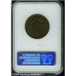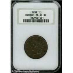 <B>1839 1C Booby Head MS64 Brown NGC.</B></I> N-5, R.1. Similar quality to two different examples in the Rasmussen Collection sale. Fully lustrous with frosty olive-brown and chocolate color, with lighter tan that is faded from original red. A wonderful example of the popular Booby Head type. Lot:5146
