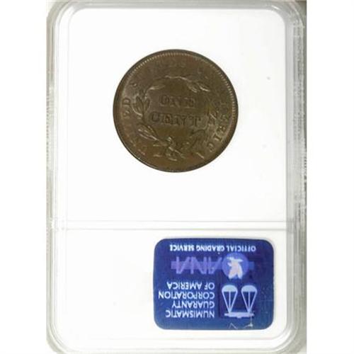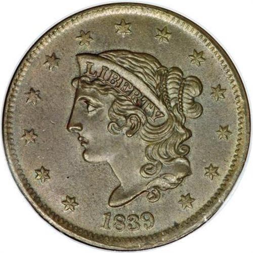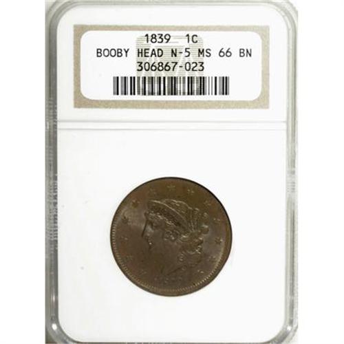 <B>1839 1C Booby Head MS66 Brown NGC.</B></I> N-5, R.3. Pristine, satiny, chocolate-brown surfaces also show an overlay of deep blue on each side. The striking definition is remarkably even between the centers and peripheries, which is somewhat unusual for big coppers from this era. Struck from an advanced state of the dies with metal flow apparent around the margins. EAC 60.<BR><I>From The Madison Collection.</B></I><BR><BR><B>Coin Engraver:</B> Robert Scot or John Reich<BR><BR><b>Shipping:</b> Coins & Currency (<a target="_blank" href="http://www.heritageauctions.com/common/shipping.php">view shipping information</a>)