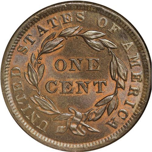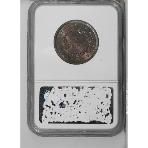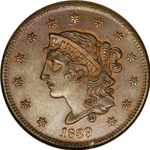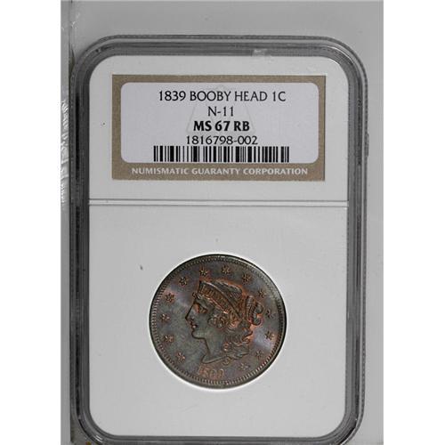 <B>1839<1C> Booby Head MS67 Red and Brown NGC.</B></I> N-11, R.1. Although names such as Booby Head and Silly Head do not suggest great respect from 19th century numismatists for Gobrecht's single-year subtypes, it has to be acknowledged that the designs are an aesthetic improvement over Scot's Matron Head. In spectacularly high grade, such as the present piece, the beauty of the modified design is readily apparent. This lustrous and sharply struck Superb Gem is originally toned in deep gunmetal-blue shades, yet it retains ample orange-red coloration about the stars, legends, and major devices. As of (6/06) it is the single highest NGC-graded 1839 cent, although a few pieces are encapsulated MS67 Brown by the service. PCGS has only certified a single Head of 1838 as MS67 Brown with none finer. EAC 63.