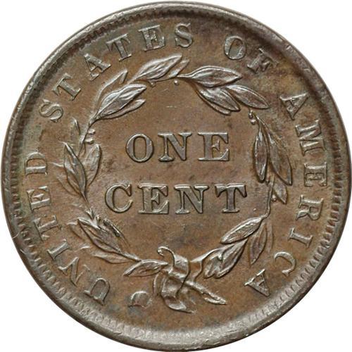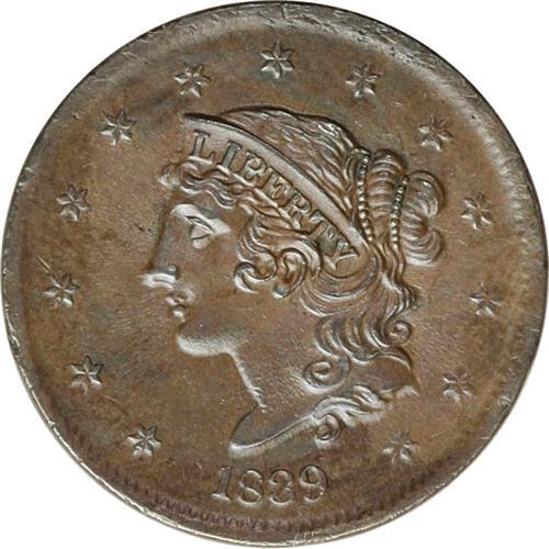 <B>1839<1C> Booby Head. N-13, R.2. MS63 Brown NGC. AU55 EAC.</B></I> A late die state with extremely strong flowlines on both sides. Several die cracks on the reverse have their appearance diminished by the flowlined surfaces. This is one of the latest states of the variety that we have seen or heard of. The central obverse and reverse are sharply defined, with considerable peripheral weakness. Lustrous dark brown surfaces with splashes of deep mahogany color along the obverse and reverse borders. A few tiny rim bruises and surface ticks are noted on each side.<BR><I>Ex: Ray (3/5/1969). Possibly Elmer Ray, a dealer from Lima, Ohio who was active at that time.</B></I> Envelope Included.