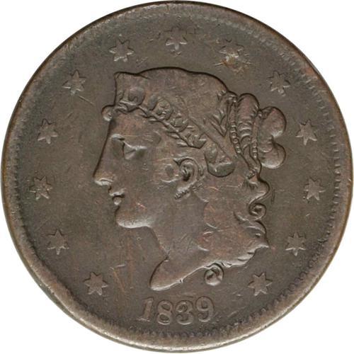 <B>1839<1C> Booby Head. N-15, Low R.6--Damaged--NCS. Fine Details. VG7 EAC.</B></I> This new variety, not listed in Newcomb, was discovered by Willard Blaisdell sometime prior to 1972. Today, just under 30 examples are known, including two in the Jules Reiver Collection. Dark steel surfaces with some reddish corrosion and other minor imperfections. The reverse surface quality prevents viewing of the characteristic die cracks that are always present. An important opportunity for the advanced collector. Envelope Included.