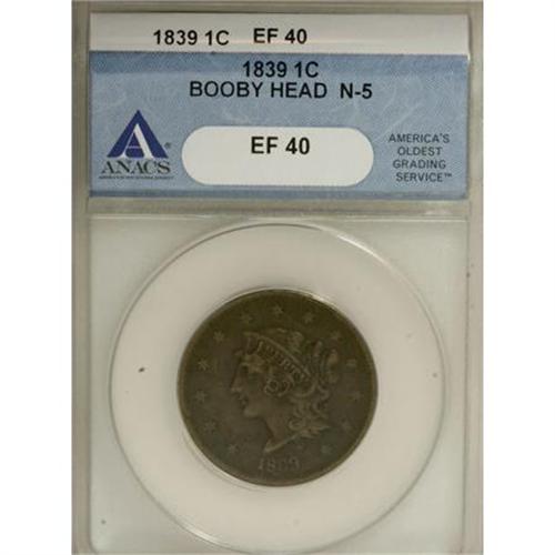 <B>1839 1C Booby Head XF40 ANACS.</B></I> N-5. NGC Census: (0/130). PCGS Population (3/89). Mintage: 3,128,661. Numismedia Wsl. Price for NGC/PCGS coin in XF40: $300. (#1751)<BR><BR><B>Coin Engraver:</B> Robert Scot or John Reich<BR><BR><b>Shipping:</b> Coins & Currency (<a target="_blank" href="http://www.heritageauctions.com/common/shipping.php">view shipping information</a>)