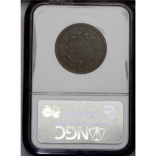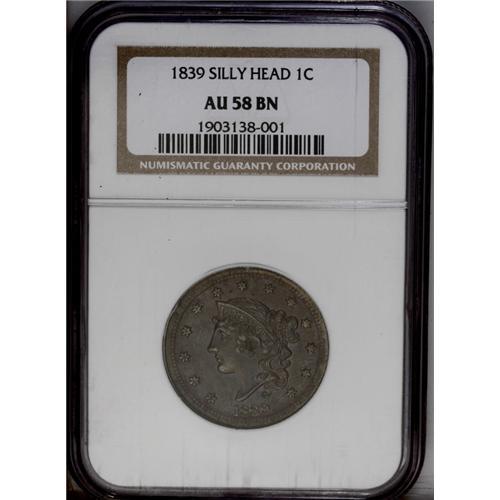 <B>1839<1C> Silly Head AU58 NGC.</B></I> N-4, R.1. A smooth medium-brown Silly Head cent with light friction on the forehead, shoulder, and wreath leaves. A minor rim mark is noted at 10 o'clock. EAC 45.