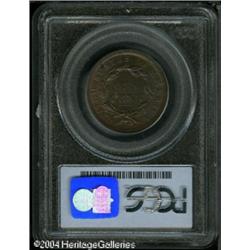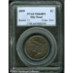 1839 1C Silly Head MS64 Brown PCGS. N.9, R.2. Plea <B>1839 1C Silly Head MS64 Brown PCGS.</B></I> N.9, R.2. Pleasing brownish-blue patination, and sharply struck design elements. There are no mentionable marks to report. This piece has considerable eye appeal. <BR><BR><B>Important notice:</B> Heritage usually auctions material at the rate of 200-250 lots per hour. On some occasions eBay Live bid software or the Internet may not be able to keep up with the pace of the auction. We recommend placing a realistic absentee bid now as insurance to avoid disappointment. Occasionally the auctioneer may eliminate or reject an eBay Live bid, and the auctioneer may also reopen a lot after the close of the eBay live bidding (usually because we missed an audience bid), and may reject your bid even if it shows you as the winning bidder. By bidding via eBay Live, you agree that Heritage may award the lot to another bidder at its sole discretion under the circumstances described above or any other reasonable circumstances. Since eBay bids are not shown to us until we open the lot on the floor, we treat those bids just like floor bids. In most cases the floor responds before the eBay bid is presented to us, due to Internet lag time, so for consistency we have made it a policy that floor bids are always considered first over tie eBay live bids. Also please note that all Heritage lots purchased through eBay Live carry a 20% Buyer's Premium. Please make sure you read the Terms and Conditions before you bid. This lot is being auctioned in conjunction with a live floor auction by Heritage Galleries & Auctioneers. All final auction and invoice information will be supplied by Heritage Galleries & Auctioneers, and all other information should be considered preliminary. Lot:5047