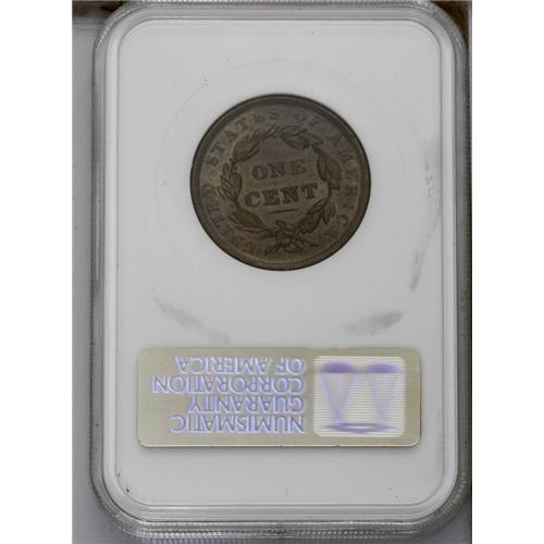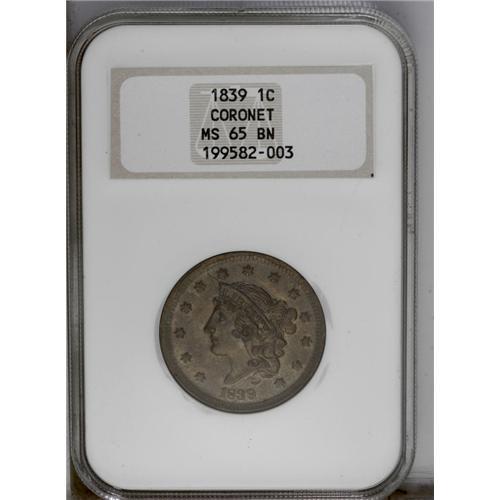 <B>1839 1C Silly Head MS65 Brown NGC.</B></I> N-9, R.2. A lustrous and smooth golden-brown near-Gem, sharply struck on the major devices. The stars and dentils have softer definition. Late dies, the obverse rim has crumbled between 11 o'clock and 1:30. In an older generation NGC holder. EAC 60.