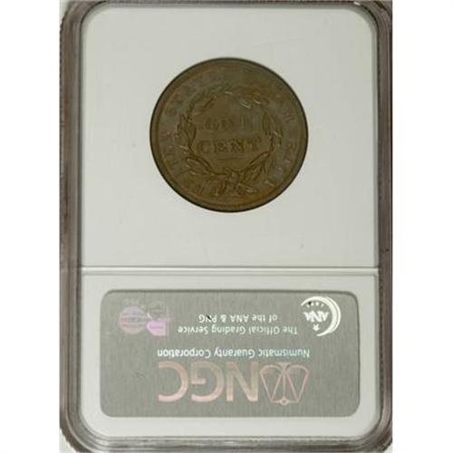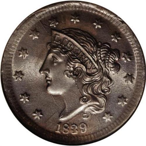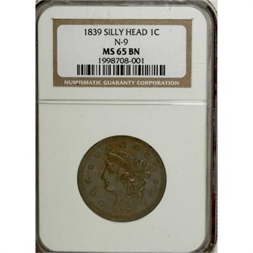 <B>1839 1C Silly Head MS65 Brown NGC.</B></I> N-9, R.2. The die crack is diagnostic with additional rim breaks along the upper obverse margin. Hints of red and violet are visible on the medium-brown surfaces, which are well-preserved and appealing. EAC 60. Census: 8 in 65 Brown, 9 finer (8/07).<BR><I>From The Beau Clerc Collection.</B></I><BR><BR><B>Coin Engraver:</B> Robert Scot or John Reich<BR><BR><b>Shipping:</b> Coins & Currency (<a target="_blank" href="http://www.heritageauctions.com/common/shipping.php">view shipping information</a>)