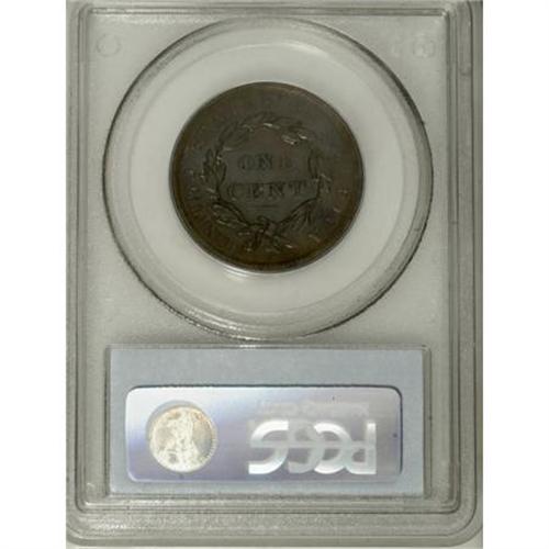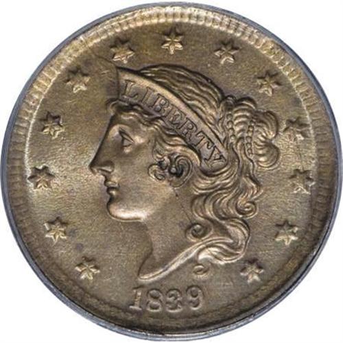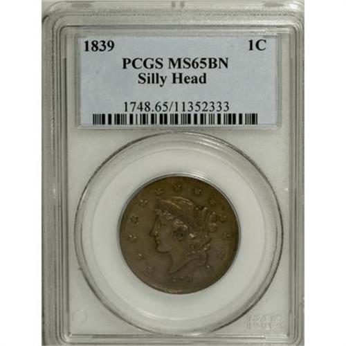 <B>1839 1C Silly Head MS65 Brown PCGS.</B></I> N-9, R.2. Noyes Die State B with "mushy" denticles. The bisecting obverse die crack from 11 to 5 o'clock allows for prompt attribution. A satiny Gem with a well struck portrait. The obverse is light golden-brown, the reverse is gunmetal-blue with glimpses of chocolate-brown. Unabraded save for a pair of minor marks near star 11. Population: 11 in 65 Brown, 5 finer (7/07). EAC 60.<BR><BR><B>Coin Engraver:</B> Robert Scot or John Reich<BR><BR><b>Shipping:</b> Coins & Currency (<a target="_blank" href="http://www.heritageauctions.com/common/shipping.php">view shipping information</a>)