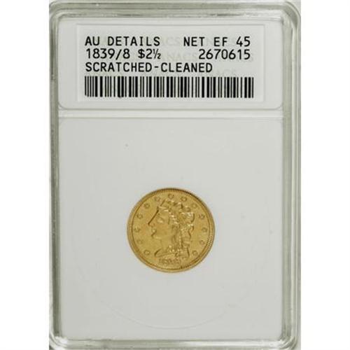 <B>1839/8 $2 1/2 --Scratched, Cleaned--ANACS. AU Details, Net XF45.</B></I> Recut 9 or 39/8, depending on one's point of view. Yellow-gold surfaces display traces of luster, along with faint hairlines under magnification. A shallow vertical scratch is visible in the hair on Liberty's neck, and a couple of short pinscratches occur on the reverse. The design elements are sharply defined. The cleaning and scratches are really not all that bad.<BR><BR><B>Coin Engraver:</B> William Kneass<BR><BR><b>Shipping:</b> Coins & Currency (<a target="_blank" href="http://www.heritageauctions.com/common/shipping.php">view shipping information</a>)