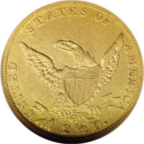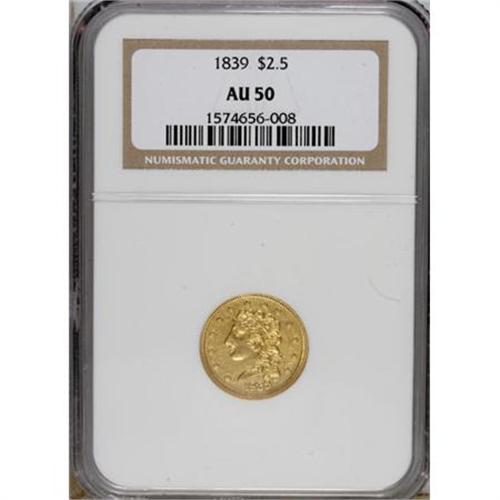 <B>1839 $2 1/2 AU50 NGC.</B></I> Breen-6148, R.3. The only known dies. Jeff Garrett and Ron Guth (2006) write that "all examples were struck from a defective punch, which, in the past, has been called an overdate (and sometimes certified as such)." Bright yellow-gold surfaces reveal hints of luster in the recessed areas, and exhibit relatively well defined motifs. A few minute marks do not significantly detract.<BR><BR><b>Shipping:</b> Coins & Currency (<a target="_blank" href="http://www.heritageauctions.com/common/shipping.php">view shipping information</a>)
