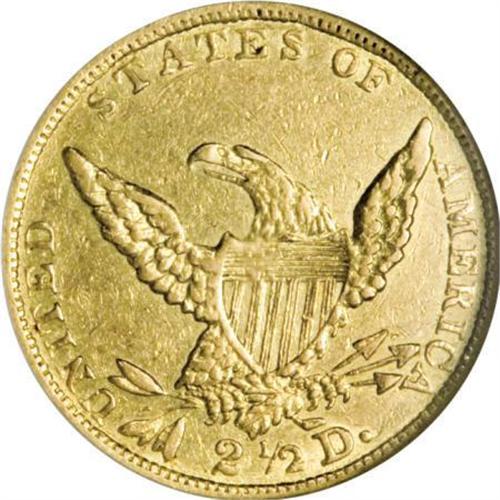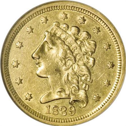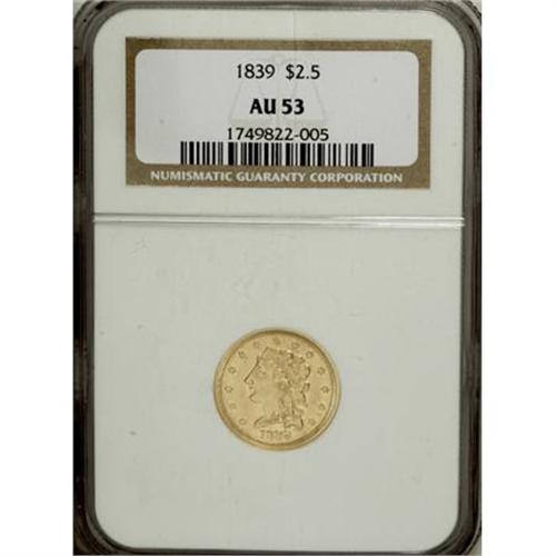 <B>1839 $2 1/2 AU53 NGC.</B></I> Only one die marriage is known for the 1839 quarter eagle, and just 27,021 pieces were struck to complete the six-year Philadelphia Mint Classic run. This clean straw-gold example has its share of glimmering luster, and the fields and portrait lack consequential abrasions.<BR><BR><B>Coin Engraver:</B> William Kneass<BR><BR><b>Shipping:</b> Coins & Currency (<a target="_blank" href="http://www.heritageauctions.com/common/shipping.php">view shipping information</a>)