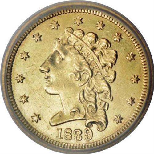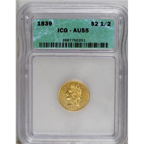 <B>1839 $2 1/2 AU55 ICG.</B></I> Breen-6148, R.3. The only known dies. This issue is scarcer than generally perceived. A fair amount of luster is retained on the yellow-gold surfaces of this choice AU example, and the design elements are well impressed. We note a few minute circulation marks over each side.<BR><BR><B>Coin Engraver:</B> William Kneass<BR><BR><b>Shipping:</b> Coins & Currency (<a target="_blank" href="http://www.heritageauctions.com/common/shipping.php">view shipping information</a>)