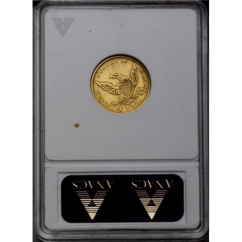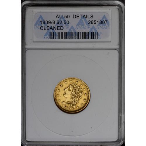 <B>1839<$2 1/2>--Cleaned--ANACS. AU50 Details.</B></I> A thickly hairlined and bright example that displays little actual wear. Only a single die pair is known for this underappreciated Classic quarter eagle issue. Only 27,021 pieces were struck.