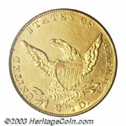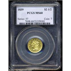 <table><tr><td><TABLE cellSpacing=0 cellPadding=0 width="100%" bgColor=#000000 border=0><TBODY> <TR><TD width="100%"><TABLE cellSpacing=1 cellPadding=3 width="100%" border=0><TBODY><TR><TD width="100%" bgColor=#79735c><FONT face=arial color=#ffffff size=3><B>Description</B> </FONT></TD></TR><TR><TD width="100%" bgColor=#ffffff><FONT face=arial size=2><B>1839 $2 1/2 MS60 PCGS.</B></I> Breen-6148, R.3. The only dies. Recut 9 or 39/8, depending on one's point of view. A very scarce and underrated issue in the Classic series and a rarity at the Mint State level, every bit as difficult to locate as the higher priced C and D Mints of the Classic Head type. This is an exceptionally well struck example with a light coating of reddish patina over each side. Although fairly numerous, none of the contact marks are particularly unsightly. Population: 1 in 60, 3 finer (10/03).<BR><I>From The New Millennium Collection.</B></I> </FONT></TD></TR></TBODY></TABLE></TD></TR></TBODY></TABLE><BR><A name=PricesRealized></A><TABLE cellSpacing=0 cellPadding=0 width="100%" bgColor=#000000 border=0><TBODY><TR><TD width="100%"><TABLE cellSpacing=1 cellPadding=3 width="100%" border=0><TBODY><TR><TD width="100%" bgColor=#79735c><A name=PR><FONT face=arial color=#ffffff size=3><B>Previous Prices from Heritage Auctions</B> </FONT></A></TD></TR><TR><TD bgColor=#f6f6ed>No Prior Data Recorded </TD></TR><TR><TD bgColor=#ffffff><FONT face=arial size=1 ?>PLEASE NOTE: All prices realized reflect the final hammer price PLUS the buyer's premium in auctions that charge a buyer's premium. Each item has a notation at the top of the listing indicating whether that lot included a buyer's premium. Example: A item that sells with a final hammer price of $100 and a 20% buyer's premium will display with a price realized of $120. All information listed is intended to be as accurate as possible, but errors are possible. Please use this guide carefully and inform us of any inaccuracies. </FONT></TD></TR></TBODY></TABLE></TD></TR></TBODY></TABLE><BR><TABLE cellSpacing=0 cellPadding=0 width="100%" bgColor=#000000 border=0><TBODY><TR><TD width="100%"><TABLE cellSpacing=1 cellPadding=3 width="100%" border=0><TBODY><TR><TD width="100%" bgColor=#79735c colSpan=6><FONT face=arial color=#ffffff size=3><B>Price Guide*</B> </FONT></TD></TR><TR bgColor=#f6f6ed><TD align=middle><B>Grade</B> </TD><TD align=middle><B>Coin World<BR>(Trends)</B> </TD><TD align=middle><B>Numismedia<BR>Retail</B> </TD><TD align=middle><B>Numismedia<BR>Wholesale</B> </TD><TD align=middle><B>Coin<BR>Universe</B> </TD><TD align=middle><B>Heritage<BR>Value Index</B> </TD></TR><TR bgColor=#ffffff><TD align=middle>58</TD><TD align=right>$4,250.00</TD><TD align=right>---</TD><TD align=right>$3,175.00</TD><TD align=right>---</TD><TD align=right>$2,610.00</TD></TR><TR style="FONT-WEIGHT: bold" bgColor=#cccfdd><TD align=middle>60</TD><TD align=right>$6,000.00</TD><TD align=right>---</TD><TD align=right>$6,000.00</TD><TD align=right>---</TD><TD align=right>$3,630.00</TD></TR><TR bgColor=#ffffff><TD align=middle>61</TD><TD align=right>---</TD><TD align=right>---</TD><TD align=right>$6,450.00</TD><TD align=right>---</TD><TD align=right>$5,640.00</TD></TR><TR bgColor=#ffffff><TD colSpan=6><FONT size=1>*All information listed is intended to be as accurate as possible, but errors are possible. No item may be returned or refused based on this information which is provided as a service to our customers. You should contact each pricing source directly to determine the accuracy of this information. </FONT></TD></TR></TBODY></TABLE></TD></TR></TBODY></TABLE><BR><TABLE cellSpacing=0 cellPadding=0 width="100%" bgColor=#000000 border=0><TBODY><TR><TD width="100%"><TABLE cellSpacing=1 cellPadding=3 width="100%" border=0><TBODY><TR><TD width="100%" bgColor=#79735c><FONT face=arial color=#ffffff size=3><B>Population Guide</B> </FONT></TD></TR><TR bgColor=#ffffff><TD align=middle><!-- Begin Output of Population Grid--><TABLE cellSpacing=0 cellPadding=0 width="100%" border=0><TBODY><TR><TD vAlign=center><TABLE cellSpacing=0 width="100%" border=1 cellsadding="3"><TBODY><TR><TD vAlign=center><TABLE cellSpacing=0 cellPadding=3 width="100%" border=1><TBODY><TR><TD vAlign=center align=middle bgColor=#f0f1e8 colSpan=2 <CENTER><FONT face=Arial size=2><B>PCGS Pop </B></FONT><CENTER></CENTER></TD><TD vAlign=center align=middle bgColor=#f0f1e8 colSpan=2><CENTER><FONT face=Arial size=2><B>NGC Pop</B></CENTER></FONT></TD></TR><TR><TD vAlign=center><FONT face=Arial size=2>(60)</FONT> </TD><TD vAlign=center align=right><FONT face=Arial size=2>1</FONT> </TD><TD vAlign=center><FONT face=Arial size=2>(60)</FONT> </TD><TD vAlign=center align=right><FONT face=Arial size=2>1</FONT> </TD></TR><TR><TD vAlign=center><FONT face=Arial size=2>(>60)</FONT> </TD><TD vAlign=center align=right><FONT face=Arial size=2>3</FONT> </TD><TD vAlign=center><FONT face=Arial size=2>(>60)</FONT> </TD><TD vAlign=center align=right><FONT face=Arial size=2>4</FONT> </TD></TR></TBODY></TABLE></TD></TR></TBODY></TABLE></TD></TR></TBODY></TABLE><!-- End Output of Population Grid--></TD></TR></TBODY></TABLE></TD></TR></TBODY></TABLE><BR><TABLE cellSpacing=0 cellPadding=0 width="100%" bgColor=#000000 border=0><TBODY><TR> Important notice: Heritage usually auctions material at the rate of 200-250 lots per hour. On some occasions eBay Live bid software or the Internet may not be able to keep up with the pace of the auction. We recommend placing a realistic absentee bid now as insurance to avoid disappointment. Occasionally the auctioneer may eliminate or reject an eBay Live bid, and the auctioneer may also reopen a lot after the close of the eBay live bidding (usually because we missed an audience bid), and may reject your bid even if it shows you as the winning bidder. By bidding via eBay Live, you agree that Heritage may award the lot to another bidder at its sole discretion under the circumstances described above or any other reasonable circumstanc