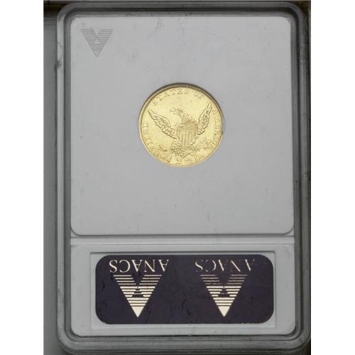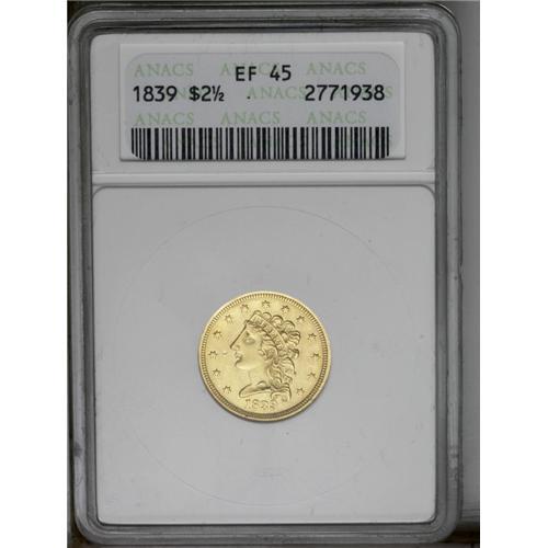 <B>1839 $2 1/2 XF45 ANACS.</B></I> Only one die pair is known for the 1839 Quarter Eagle, not too surprising given the small emission of 27,021 pieces. The present piece possesses the sharpness of a finer grade, but the pale gold surfaces are slightly subdued, and a small mark is seen near the third star.