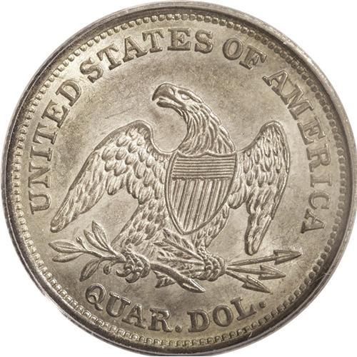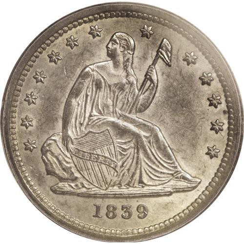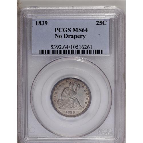 <B>1839<25C> No Drapery MS64 PCGS.</B></I> Closed Claws Reverse. Ice-blue and apricot-tan patina embraces this well struck and unmarked early Seated quarter. Drapery was introduced beneath Liberty's elbow in 1840, ending production of the two-year No Drapery subtype. Population: 8 in 64, 2 finer (6/06).