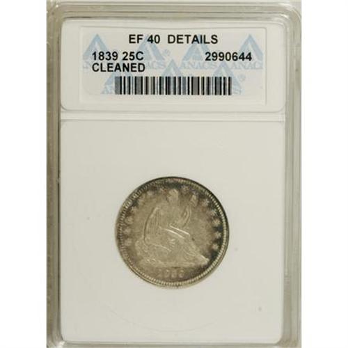 <B>1839 25C No Drapery--Cleaned--ANACS. XF40 Details.</B></I> NGC Census: (9/81). PCGS Population (6/85). Mintage: 491,146. Numismedia Wsl. Price for NGC/PCGS coin in XF40: $375. (#5392)<BR><BR><B>Coin Engraver:</B> Christian Gobrecht<BR><BR><b>Shipping:</b> Coins & Currency (<a target="_blank" href="http://www.heritageauctions.com/common/shipping.php">view shipping information</a>\)