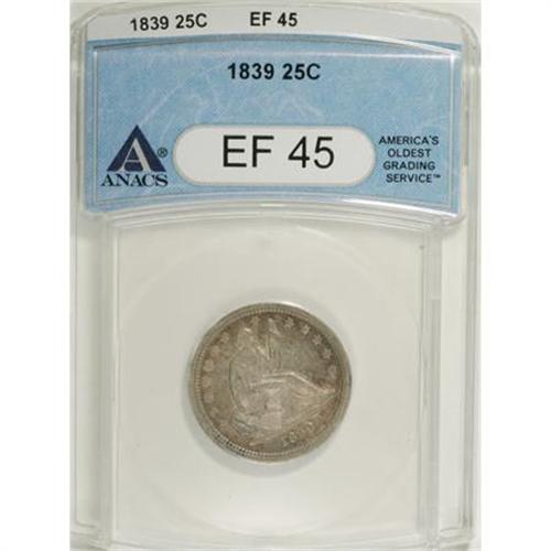 <B>1839 25C No Drapery XF45 ANACS.</B></I> NGC Census: (12/68). PCGS Population (10/74). Mintage: 491,146. Numismedia Wsl. Price for NGC/PCGS coin in XF45: $426. (#5392)<BR><BR><B>Coin Engraver:</B> Christian Gobrecht<BR><BR><b>Shipping:</b> Coins & Currency (<a target="_blank" href="http://www.heritageauctions.com/common/shipping.php">view shipping information</a>\)