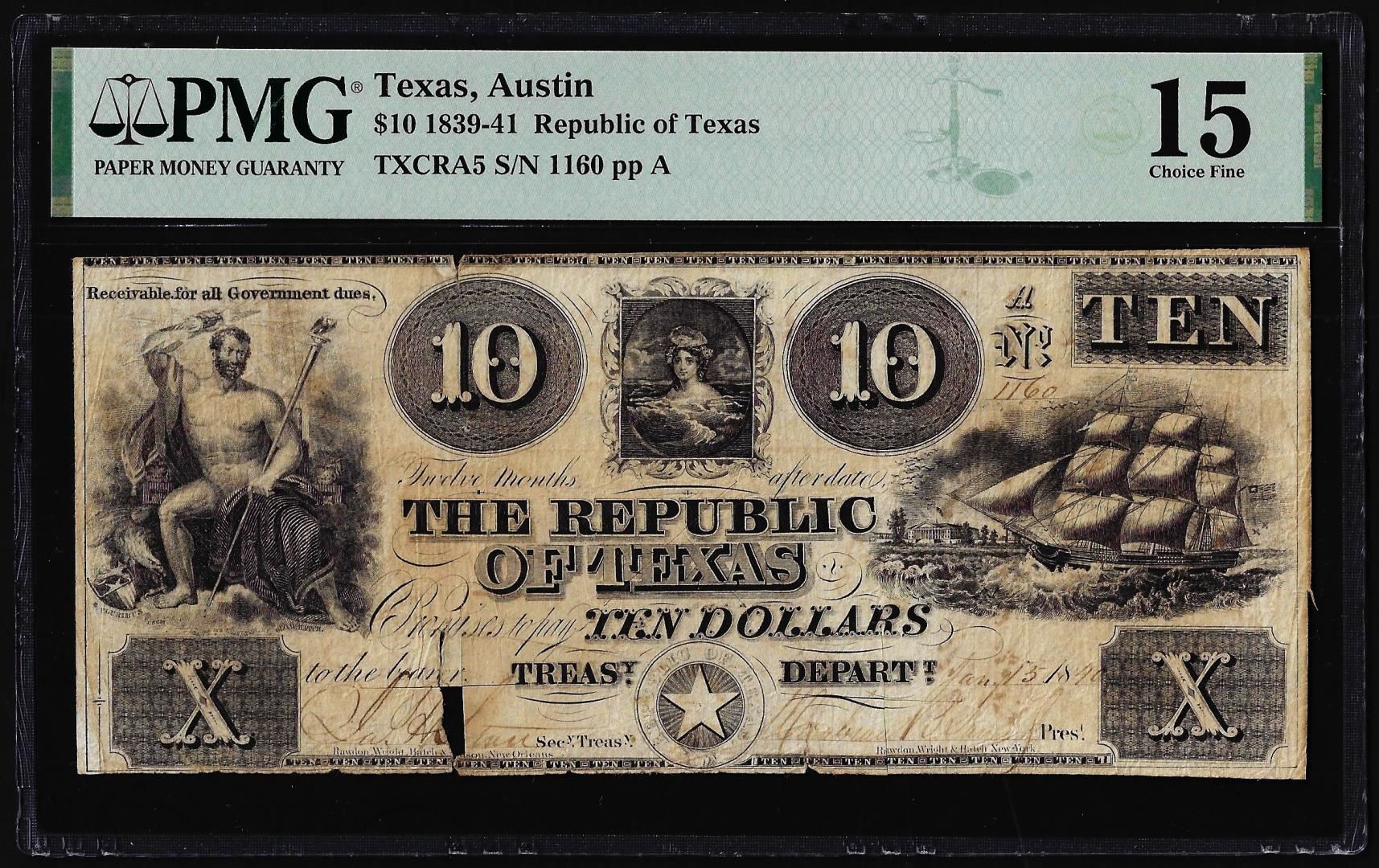 One 1839-41 $10 Republic of Texas Austin, TX Obsolete Note TXCRA5 PMG Choice Fine 15. PMG Certified.