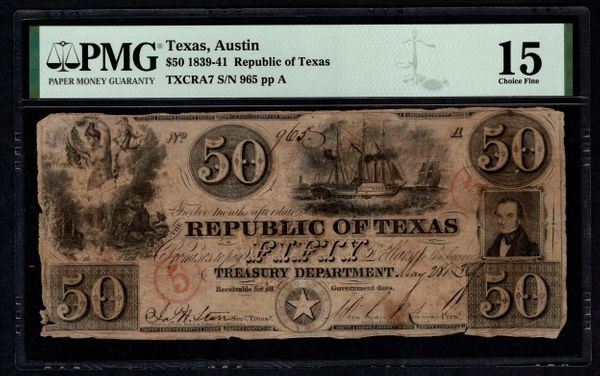 One 1839-41 $50 Austin Republic of TX Note PMG 15.