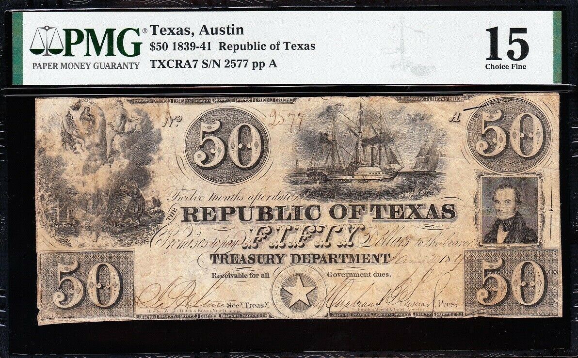 One 1839-41 $50 Austin TX Obsolete Note PMG 15.
