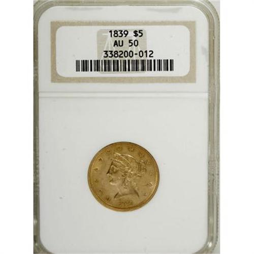 <B>1839 $5 AU50 NGC.</B></I> A still-lustrous, lightly circulated lemon-gold example of this early Liberty half eagle issue. The fields show few marks overall, though a scrape appears to the left of the penultimate obverse star.<BR><BR><B>Coin Engraver:</B> Christian Gobrecht<BR><BR><b>Shipping:</b> Coins & Currency (<a target="_blank" href="http://www.heritageauctions.com/common/shipping.php">view shipping information</a>)
